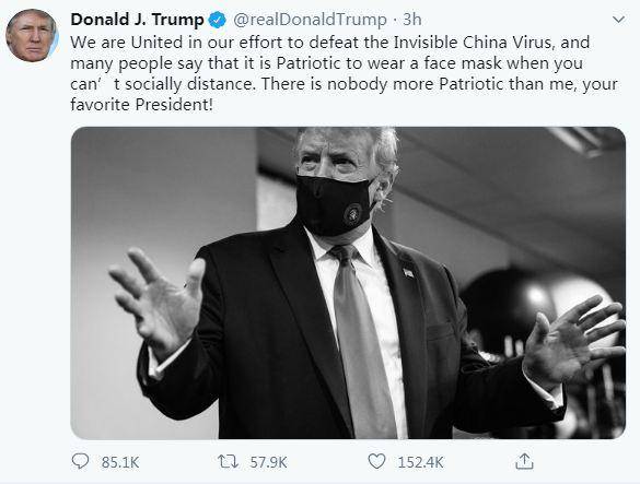 特朗普在推文中写道:「我们正团结一致,共同抗击看不见的『中国病毒』。许多人称,当你无法保持社交距离时,戴口罩是一种爱国行为。没有人比我,你们最喜爱的总统,更爱国!」
