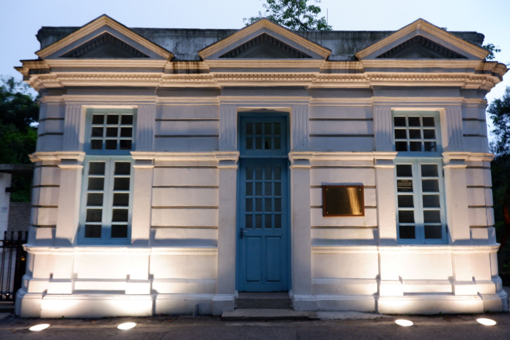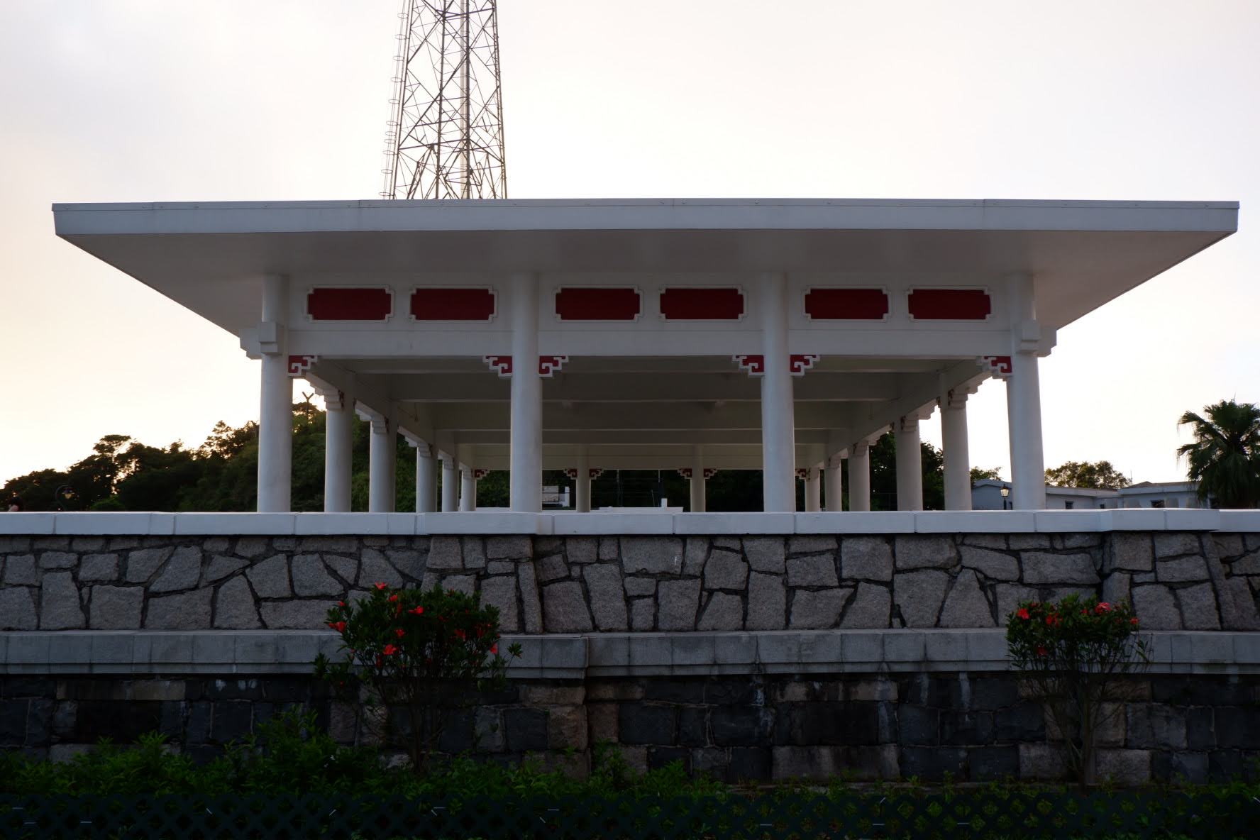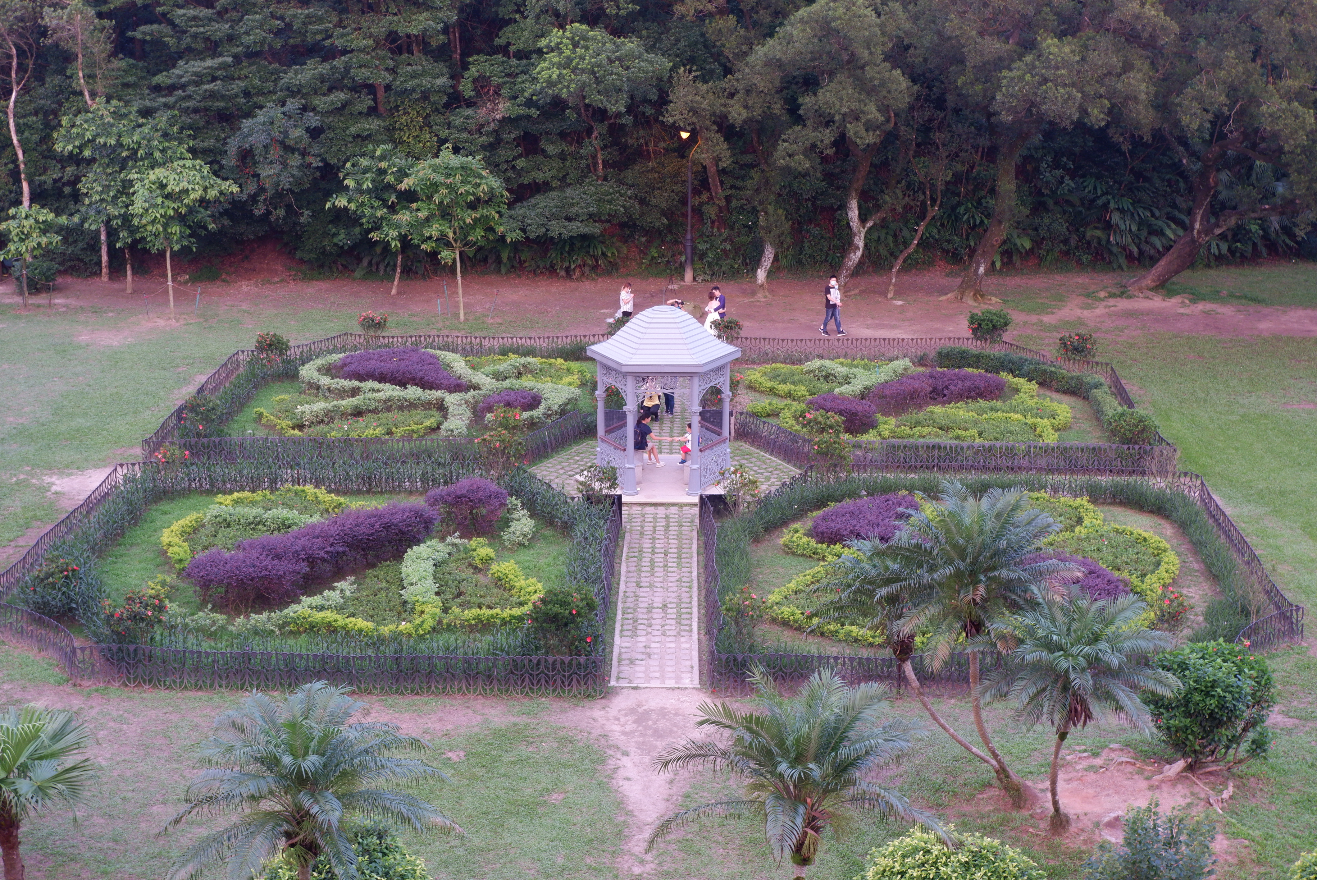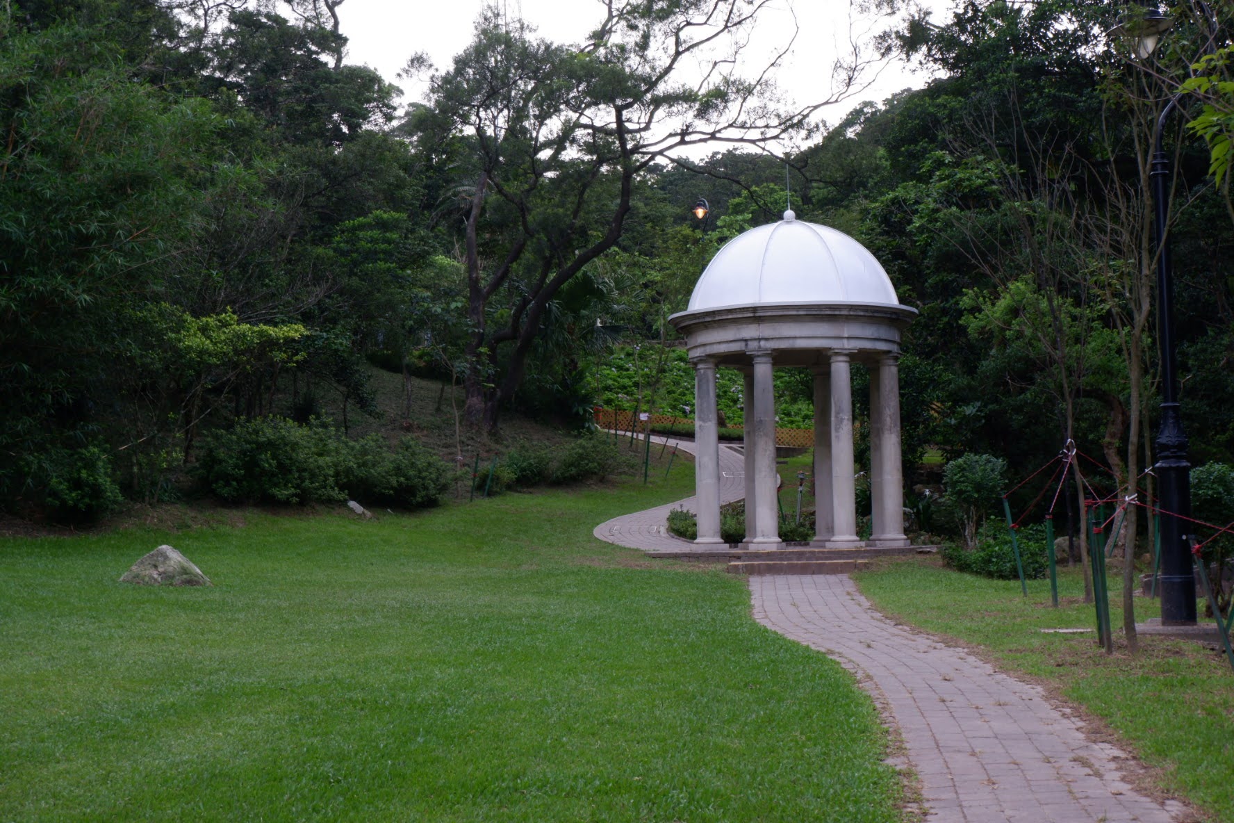 在中央花圃再上一層,到達於1979年加建的山頂公園涼亭,前身為別墅遺址,涼亭前後都放有一對石獅子,可以遠眺西高山、薄扶林水塘及南丫島一帶開闊的景色。夕陽西下,雲霧繚繞,感覺可抓住一片雲在手中,放空地看着隨風飄曳的雲霧,疫情引發的緊張感也隨之飄散。