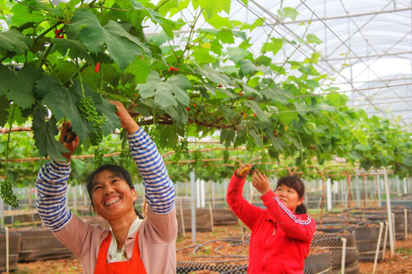 南雄千畝陽光玫瑰葡萄園種植基地果農正在修剪枝葉(賴信英攝)