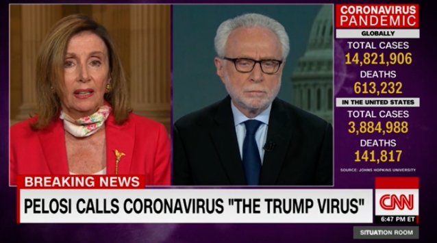 據CNN報道,佩洛西直指特朗普當天在疫情簡報會上的表現「說明他終於承認了自己的錯誤」,認識到疫情不是一場「騙局」,且戴口罩有用。佩洛西稱,由於特朗普此前的種種行為,疫情在好轉之前,「事實上已經變得更糟糕了」,這是一個「特朗普病毒」。「如果他幾個月前就說應該戴上口罩,保持社交距離,而不是舉行集會或政治活動,那麼會有更多的人效仿美國總統。」她說,「讓美國民眾受傷害的顯然是『特朗普病毒』。」