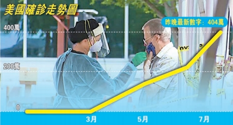 在新一波疫情較嚴重的加州,確診已逾40萬,是繼紐約州後第二個突破40萬宗的州份。另外,為防止疫情蔓延,紐約州、新澤西州及康涅狄格州將31個州份列入隔離名單,任何人從名單上的州份入境這三個州,均須自我隔離14日。
