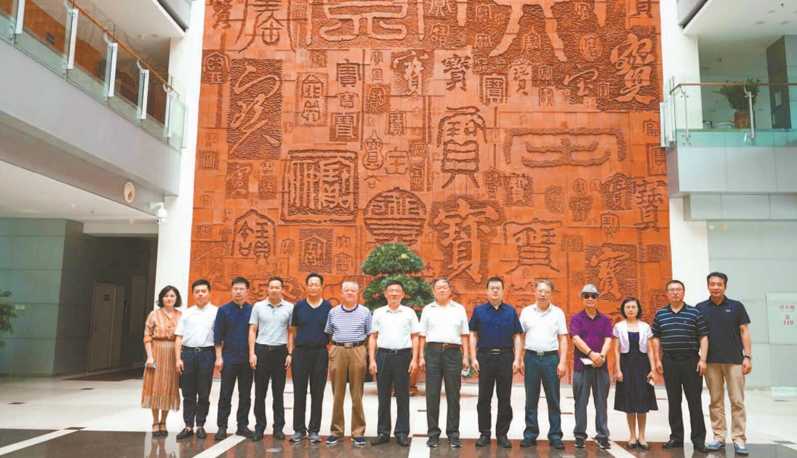 作家採風團團長蔣子龍(左八)一行與寶安區委常委、區政府黨組成員周學良(左七)、香港商報副總編輯王軍(右六)等在寶安區政府一樓大廳合影