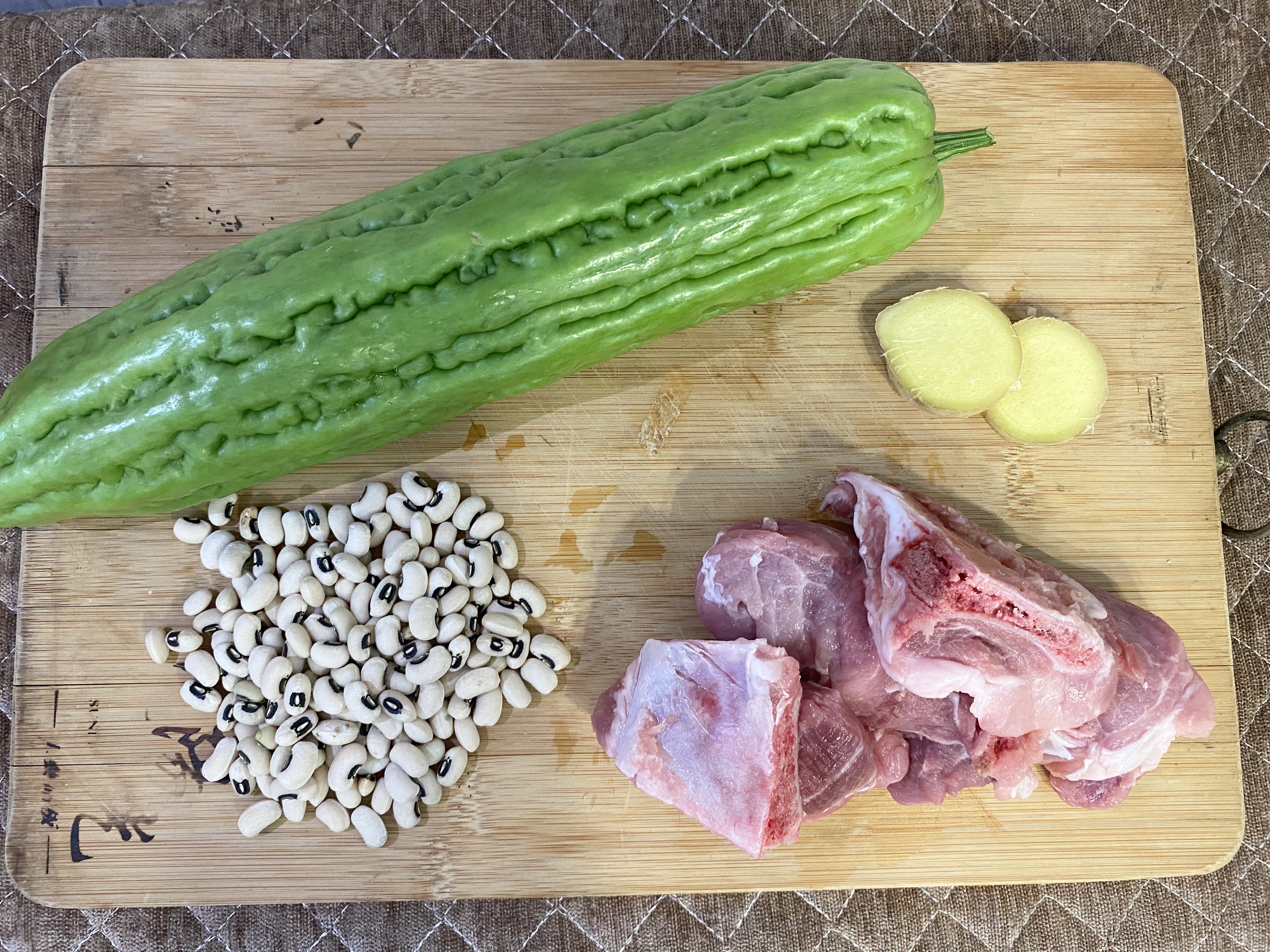 材料:苦瓜 2 個、排骨 400 克、眉豆50 克、薑2 片。