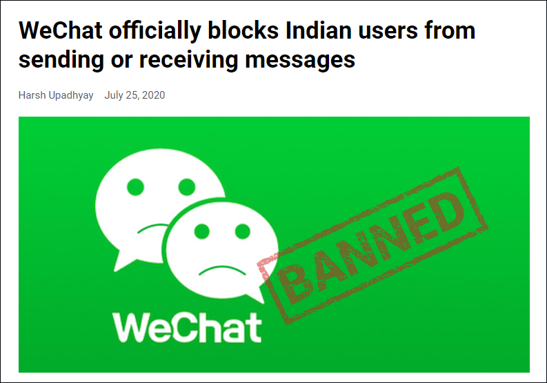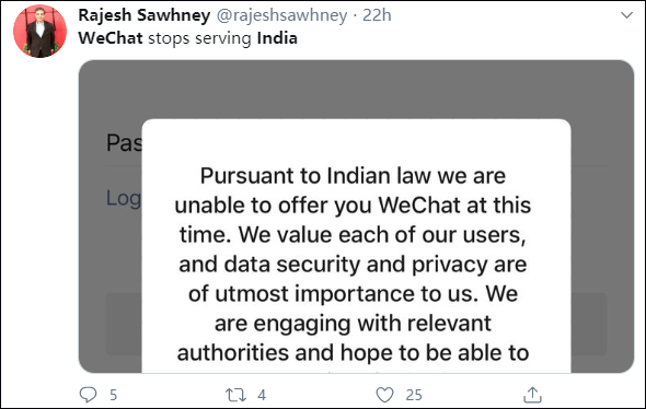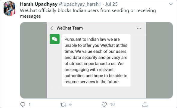 據報道,在賬號被强制登出時,用戶會收到一條來自微信官方團隊的信息,上面寫道:“根據印度法律,我們現在不能爲您提供微信服務。我們重視每一個用戶,數據安全和隱私對我們來說是最重要的。我們正在與相關部門交涉,希望能够在未來恢復服務。”