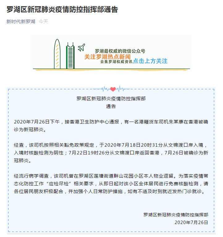 【香港商報網訊】昨晚11時,羅湖區新冠肺炎疫情防控指揮部發布通告稱,2020年7月26日下午,接香港衛生防護中心通報,有一名港籍貨車司機朱某康在香港被確診爲新冠肺炎。