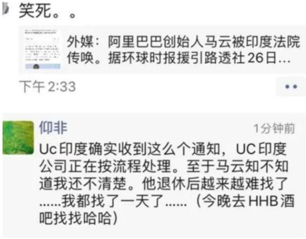 對此消息,阿里巴巴合夥人王帥在朋友圈回應稱,UC印度確實收到通知,UC印度公司正在按流程處理。針對案件對於馬雲的傳喚,王帥表示,「馬雲知不知道我還不清楚。他退休後越來越難找了,我都找了一天了,今晚去HHB酒吧找找啊。」