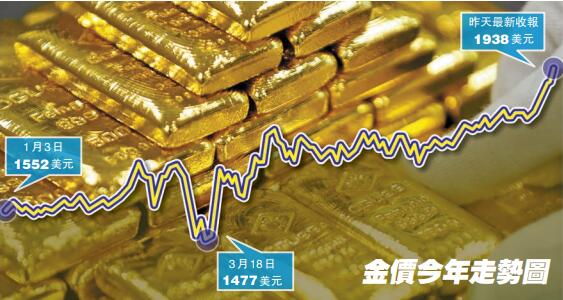【香港商報網訊】受惠美元偏軟及避險需求增加,現貨金價昨一度突破每盎司1940美元,創歷史新高。今次是相隔近9年來,金價再次破頂,較上次高位高出最少每盎司20美元。分析人士指,多個經濟體疫情還沒有得到有效控制,很多投資者擔憂疫情二次爆發,避險情緒大升導致金價上漲。