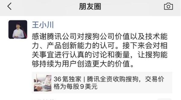 搜狗CEO王小川随後也在朋友圈转发相关文章予以证实,称感谢腾讯的认可,接下来会对腾讯收购公司的相关事宜进行认真讨论和衡量。
