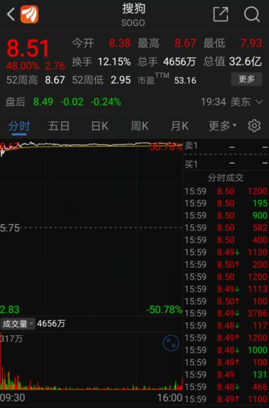 【香港商报网讯】7月27日晚,搜狗宣布腾讯拟以9美元/股现金收购搜狗剩餘股权,完成後,搜狗将从美国纽交所退市,成为腾讯旗下全资子公司。消息一出,搜狗股价暴涨近50%至8.5美元附近。截至收盘,搜狗在美股涨超48%,报8.51美元,市值增加10美元(约合人民币70亿元),现总市值32.57亿美元。