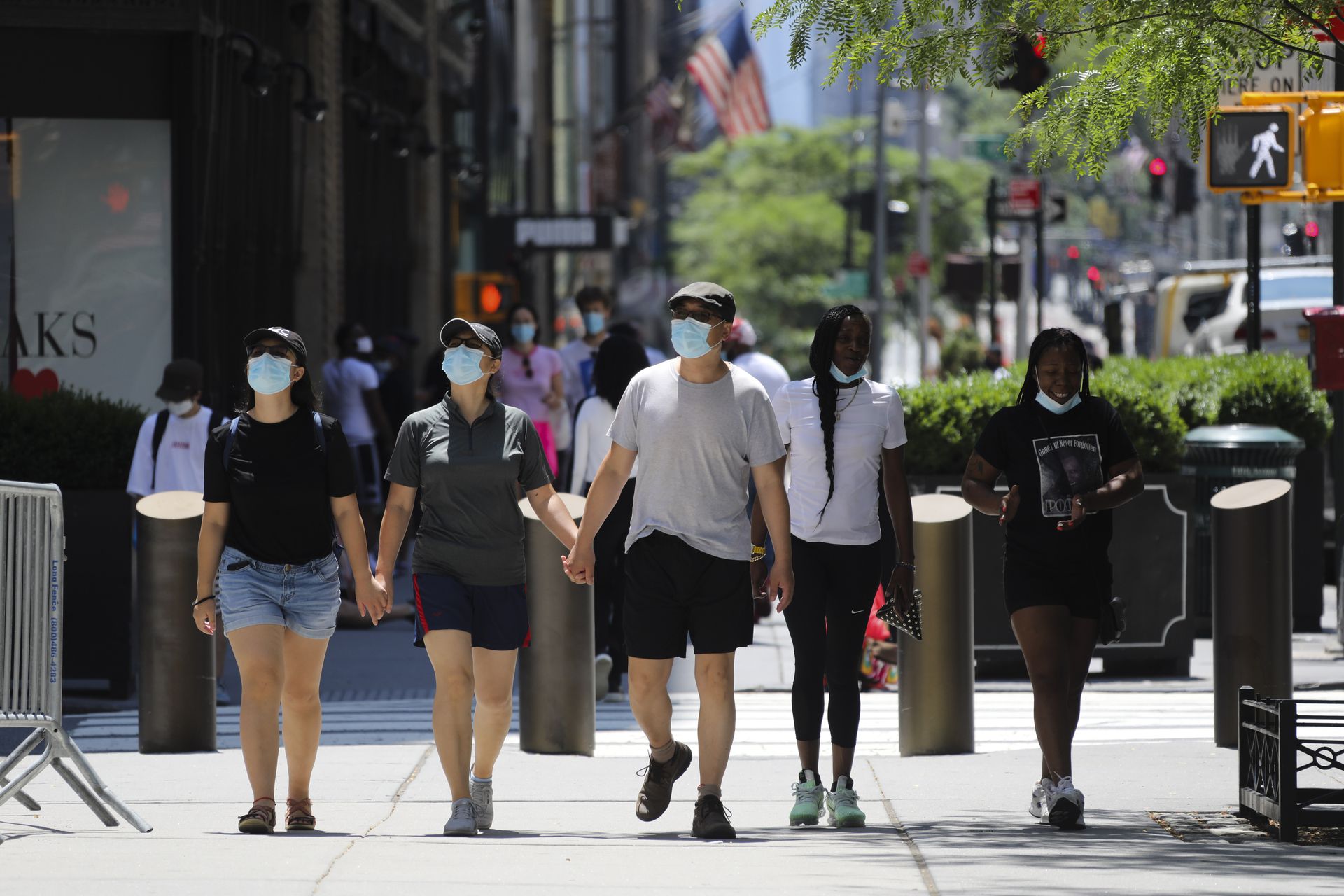 受疫情影响,美国2020年二季度经济陷入大衰退。图为7月4日,人们戴着口罩走在美国纽约第五大道。(新华社)