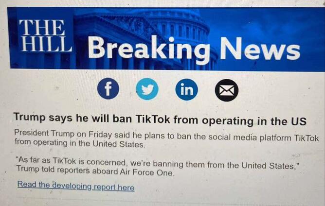 【香港商报网讯】据美国媒体报道:美国总统特朗普周五在空军一号上对记者说,将禁止社交媒体tiktok在美国开展业务。