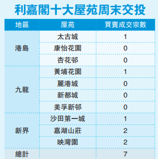 利嘉閣地產總裁廖偉強表示,本港新冠疫情嚴峻,買家入市步伐減慢,資金態度轉趨審慎。十大指標屋苑累錄7宗二手買賣個案,按周大減42%,是近8個周末以來首次跌穿10宗雙位數字水平,並創近26周新低。他又指出,中美關係持續緊張亦令到部分資金入市較為審慎。