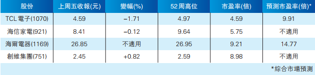 海信是內地目前最大的製冷家用電器集團之一,其品牌名稱包括「科龍」及「容聲」。「科龍」在1984年起生產電冰箱,現在以空調市場為主,冰箱由「容聲」品牌來銷售。目前家電銷售反彈,加上進入夏季,空調需求量大,為公司業務帶來利好因素。