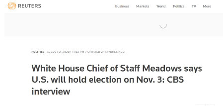 【香港商报网讯】据路透社消息,当地时间2日,美国白宫幕僚长马克•梅多斯接受美国哥伦比亚广播公司(CBS)政论节目采访时表示,美国将于11月3日举行大选,「总统会胜选。」此外,他在采访中还称,对短期内达成下一轮新冠疫情纾困法案「不乐观」。