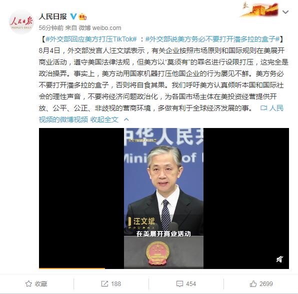 对于Tik Tok事件,外交部发言人汪文斌今日表示,有关企业按照市场原则和国际规则在美展开商业活动,遵守美国法律法规,但美方以“莫须有”的罪名进行设限打压,这完全是政治操弄。事实上,美方动用国家机器打压他国企业的行为屡见不鲜。美方务必不要打开潘多拉的盒子,否则将自食其果。我们呼吁美方认真倾听本国和国际社会的理性声音,不要将经济问题政治化,为各国市场主体在美投资经营提供开放、公平、公正、非歧视的营商环境,多做有利于全球经济发展的事。