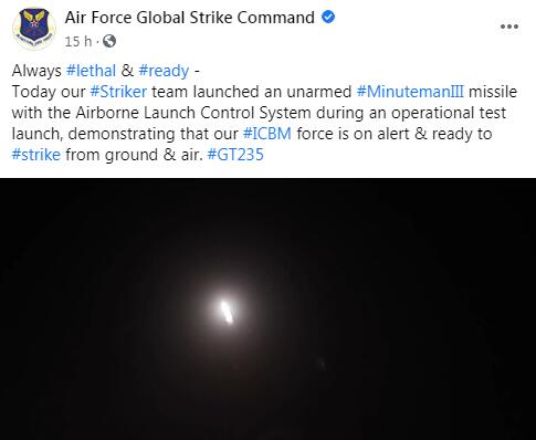 美国空军全球打击司令部还在消息中强调,发射日程表是提前3到5年制定的,每次单独的发射计划是在发射前的六个月到一年时间内开始准备,这次发射与当前世界发生的任何事件都无关。
