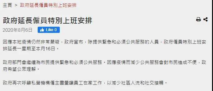政府發言人今(6日)宣布,除了提供緊急和必須公共服務的人員外,政府雇員居家工作安排將會延長一星期至8月16日。政府會密切監察疫情的發展,屆時再檢視情況。