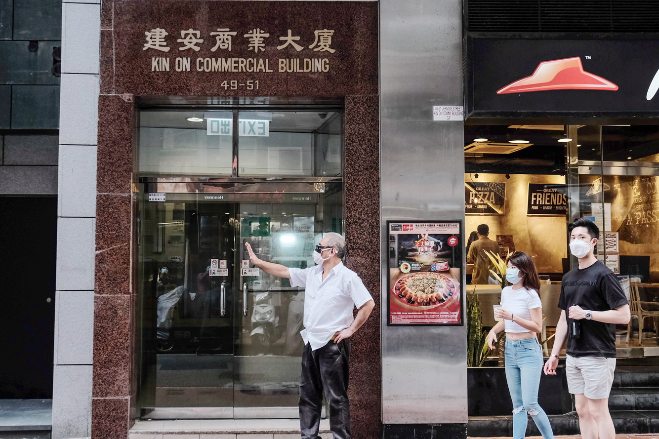 衛生防護中心傳染病處主任張竹君昨通報,一名初步確診印傭,曾於7 月在安盛僱傭公司與多名女傭同住。圖為安盛僱傭公司所在的建安商業大廈。中通社