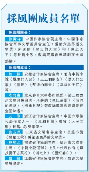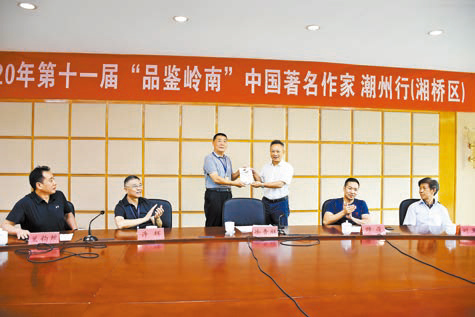 潮州市湘橋區委書記佘楚雄(右三)與中國作協副主席、潮州採風團團長徐貴祥(左三)贈書合影留念