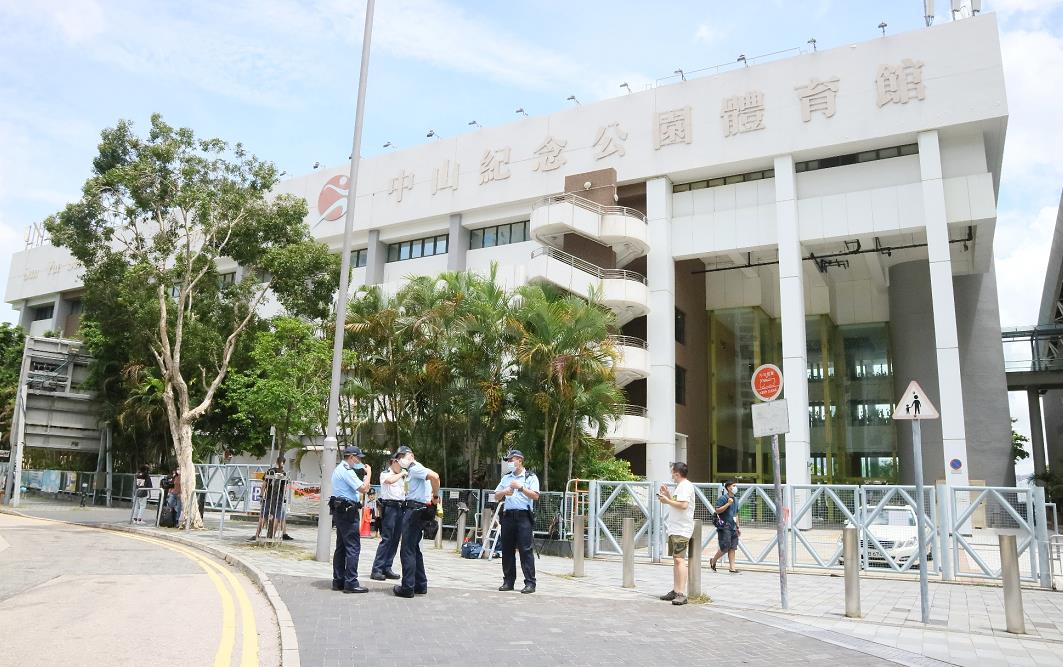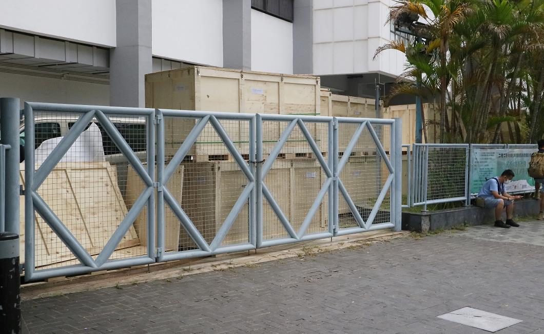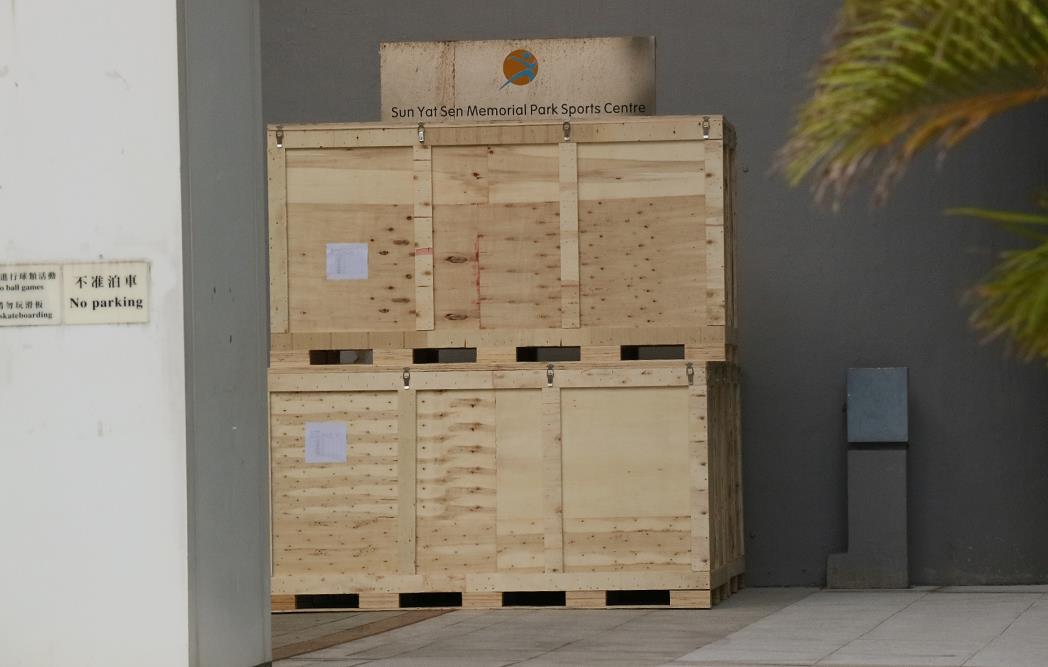 【香港商報網訊】香港新冠肺炎疫情嚴峻,有消息指政府計劃挑選度假營及大型體育館改建成社區治療設施。有媒體昨晚(6日)發現一輛掛有「華大基因火眼實驗室援港物資」橫額的貨車,駛入西環中山紀念公園體育館,並卸下最少14箱貨物,部分木箱貼有紙條,寫有包括「微電腦連鎖傳遞窗」、「氣膜帳篷」、「光交互智能前門」及配件等,多名內地人員,警方亦在場。今早(7日)警方在中山紀念公園體育館內外駐守。(馮瀚文攝)