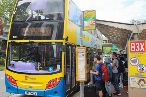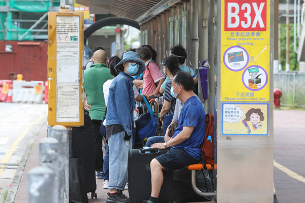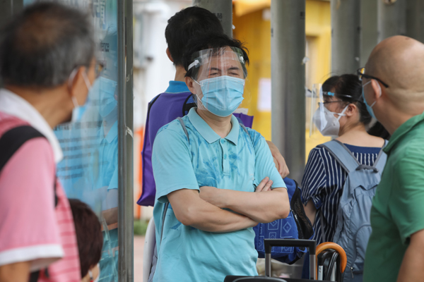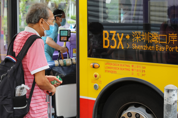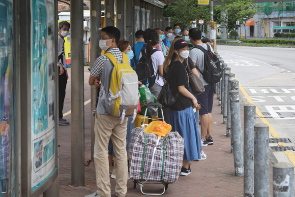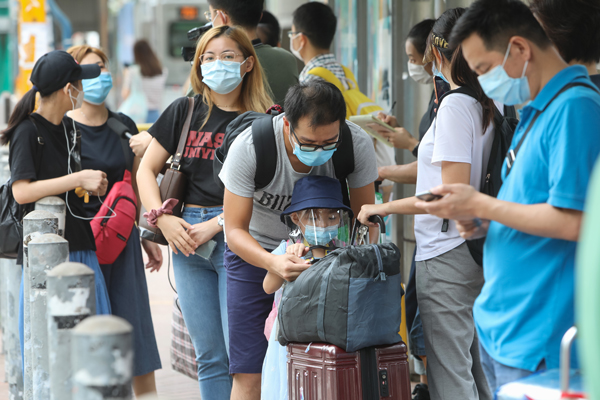 圖為收緊防疫措施首日,上午10時許,有不少香港市民在深圳灣口岸外排隊等待離港入境。中新社
