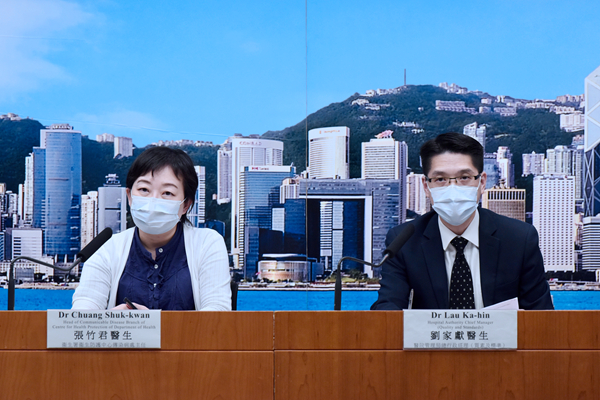 8月7日,香港特区政府卫生署卫生防护中心传染病处主任张竹君(左)、医院管理局总行政经理(质素及标准)刘家献(右)出席记者会。中新社