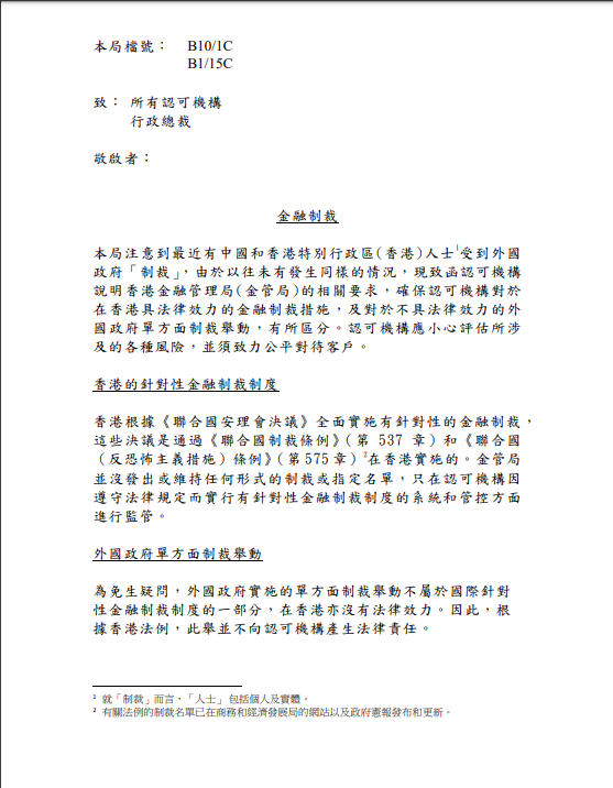 金管局因應美方的制裁行動發出通告,指由於過往未曾發生同樣情況,因而致函認可機構及儲值支付工具持牌人,說明金管局的相關要求。
