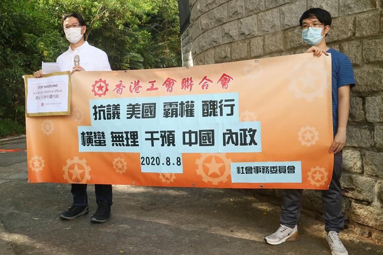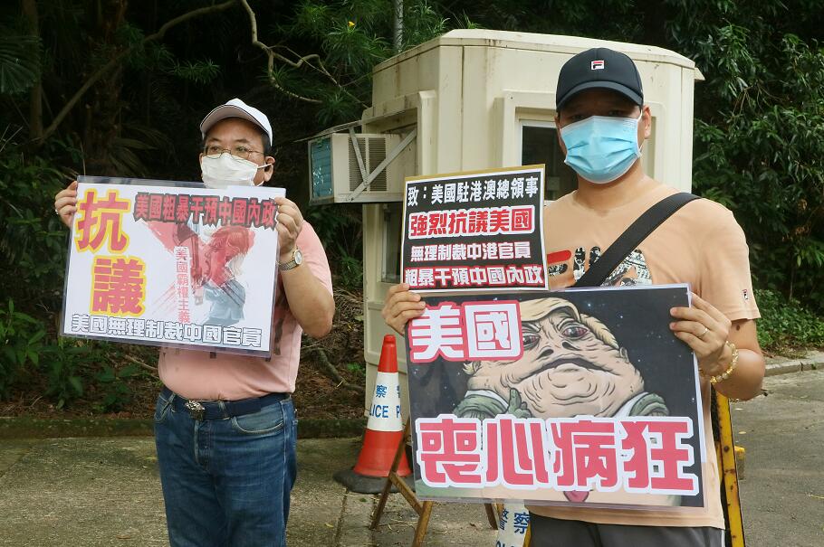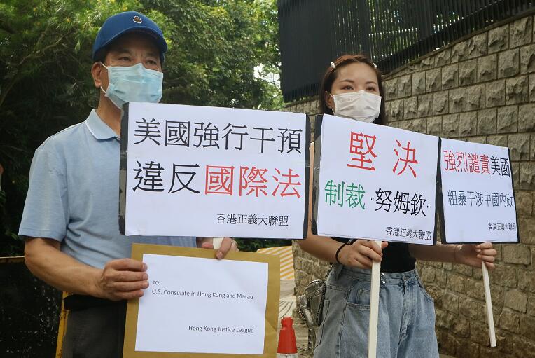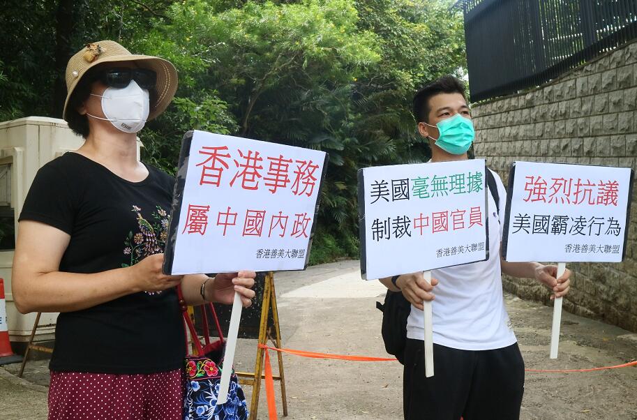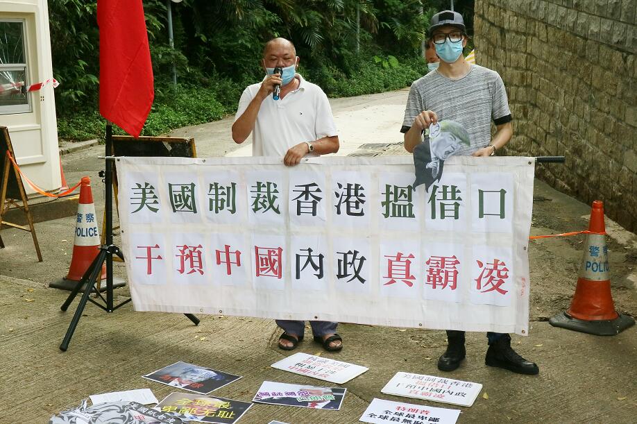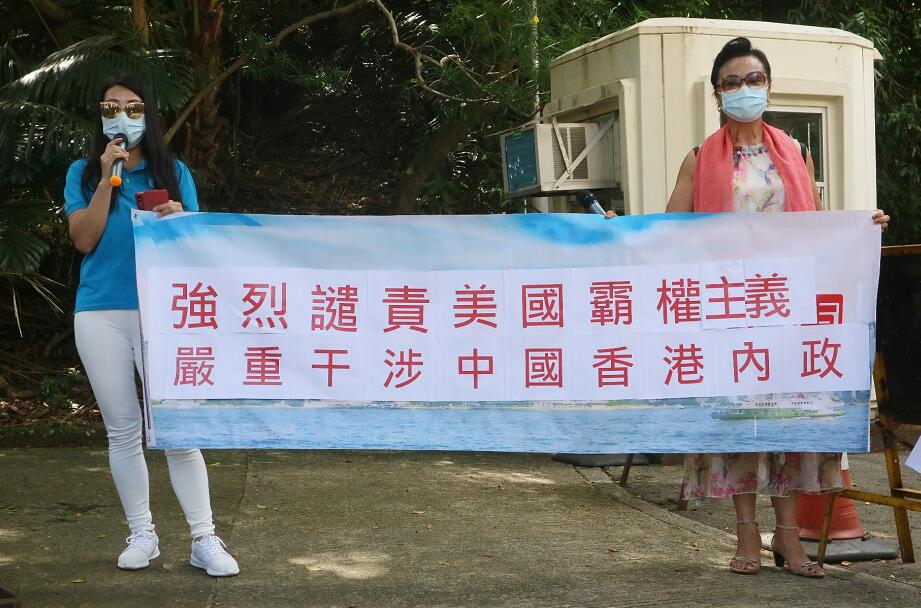 【香港商報網訊】今日(8日)下午繼續有多個團體到美國領事館示威,抗議美國提出制裁11名中國和香港官員,粗暴干預中國和香港內政,團體包括:民建聯、工聯會、反美大聯盟、同心護港、香港正義大聯盟、香港善美大聯盟、沙田各界大聯盟、西貢居民、將軍澳居民、東方之珠等,這些團體都指美國虛偽及雙重標準,對自己國家安全重視同時,卻對港區國安法落實加以干預。(香港商报记者馮瀚文攝)