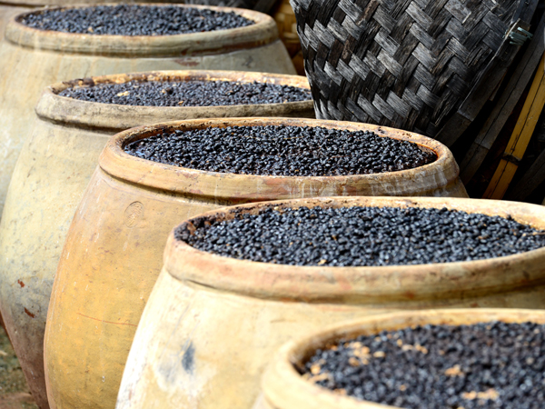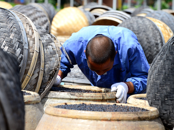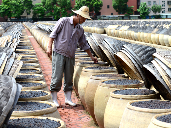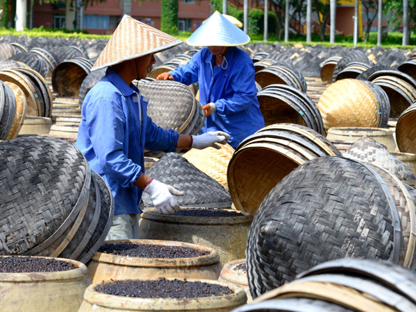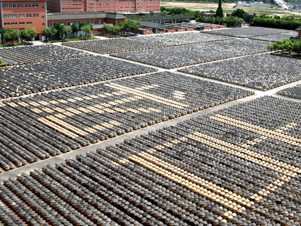【香港商報網訊】據中新社報道,在福建省廈門市同安區的“古龍”醬文化園曬場上,6萬口醬缸整整齊齊地排列著,這裏傳承著百年曆史的古法醬油釀造技藝。白天,工人們依次打開醬缸,使醬缸中的微生物迅速發酵,這就是日曬;到了晚上,醬味開始濃縮,這就是夜露。古法制醬保留了日曬夜露的過程,最短的都需要一年。(圖源:中新社)