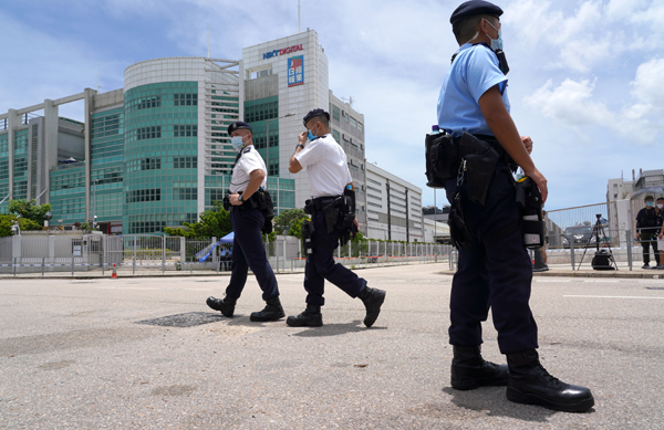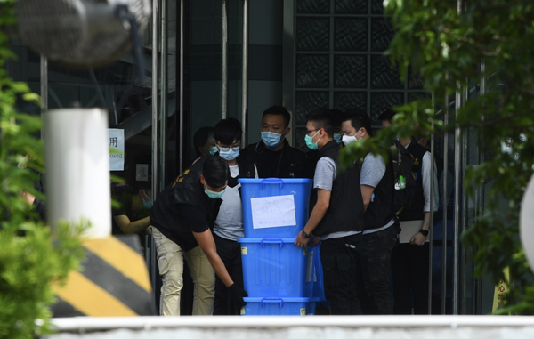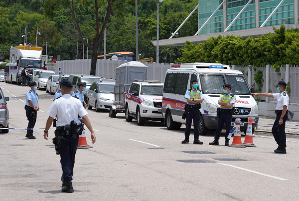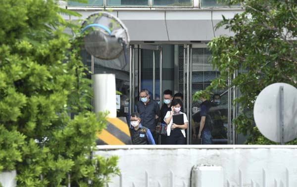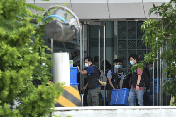 據中新社報道,8月10日中午,壹傳媒創辦人黎智英被押返蘋果日報大樓調查後,由警車押走。當天上午,壹傳媒創辦人黎智英等7人涉嫌違反香港國安法及串謀欺詐罪被香港警方拘捕。(圖源:中新社)