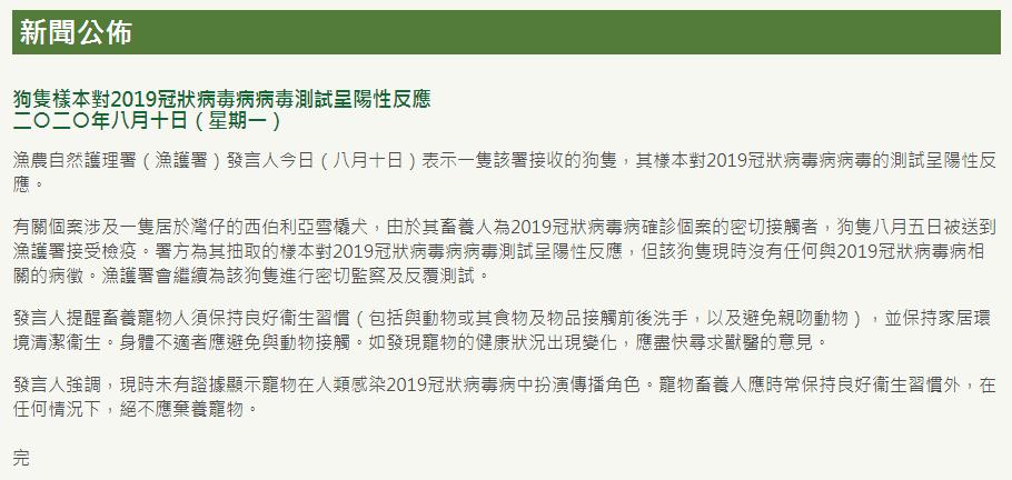 署方發言人指,涉事狗隻上周三(5日)因其主人確診新冠肺炎而被送到漁護署接受檢疫,其後對新冠肺炎病毒測試呈陽性反應,但其現時無任何相關病徵,漁護署會繼續為該狗隻進行密切監察及反覆測試。