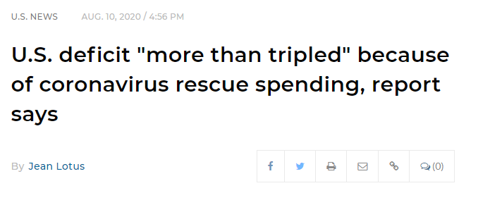 据美国合众国际社(UPI)报道,美国国会预算办公室在8月10日的报告中提到,2020财年的前10个月中,美国联邦预算赤字较2019年同期增加了2倍,达2.8万亿美元,2019年同期为0.9万亿美元。
