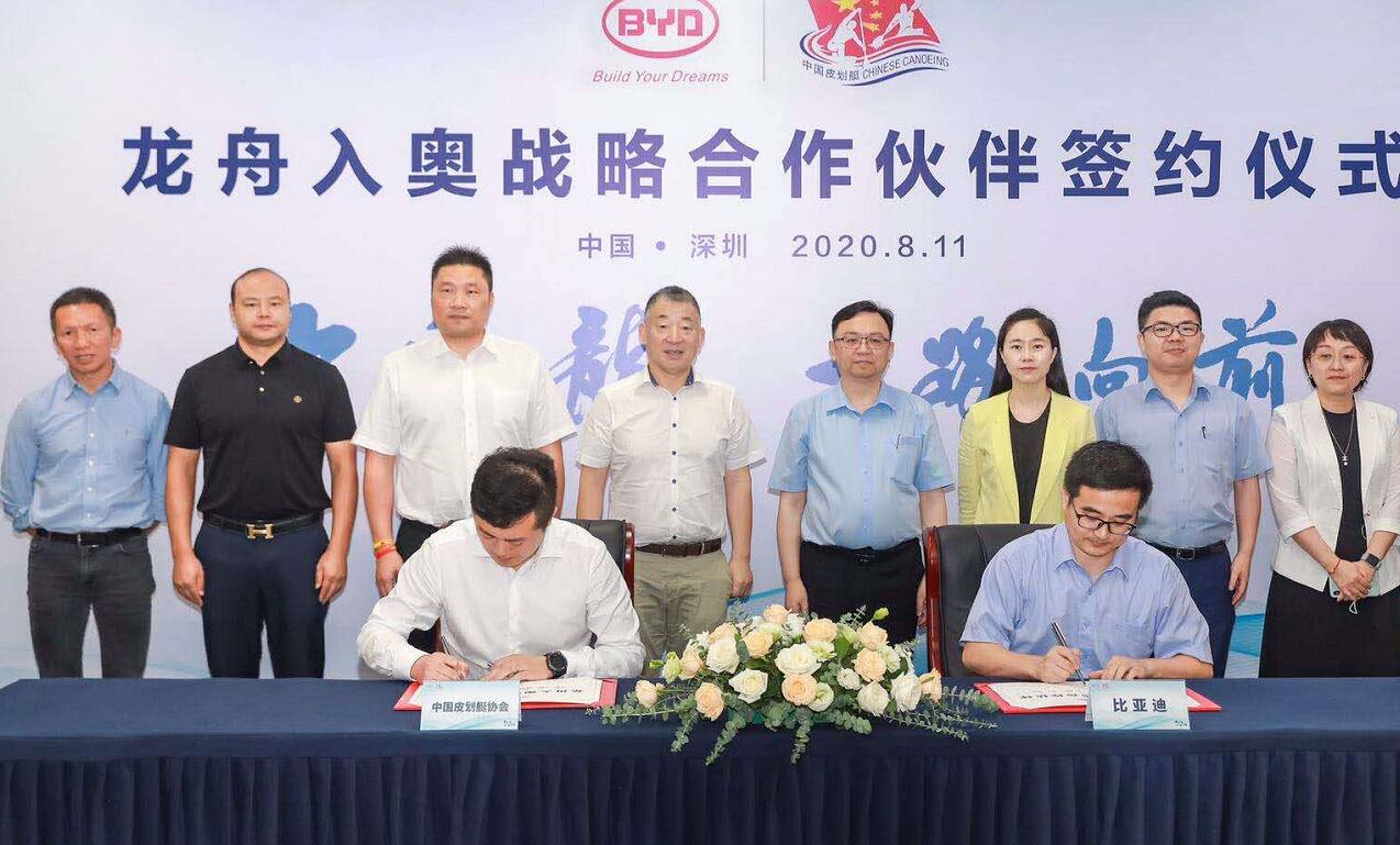 【香港商报网讯】记者焦家志 通讯员张枫报道: 8月11日,比亚迪与中国皮划艇协会在深圳签约,成为“龙舟入奥战略合作伙伴”,双方将在推动龙舟进入奥运会和设计研发“竞技型龙舟”等诸多领域展开深度合作。中国皮划艇协会主席刘爱杰,雅典和北京奥运会男子双人划艇世界冠军孟关良、杨文军,比亚迪股份有限公司董事长兼总裁王传福等出席了签约仪式。