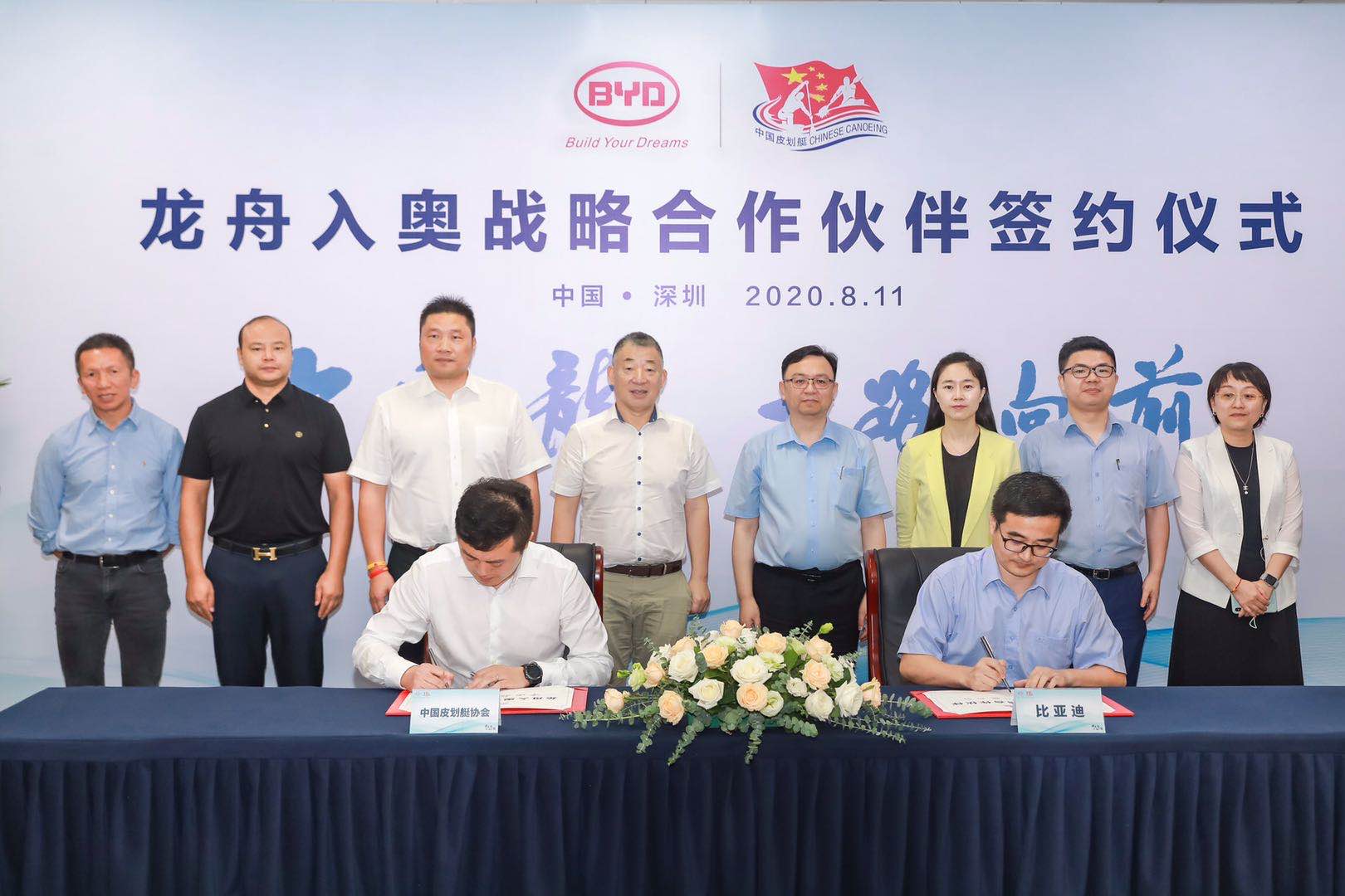 【香港商報訊】記者焦家志通訊員張楓報道: 8月11日,比亞迪與中國皮划艇協會在深圳簽約,成為「龍舟入奧戰略合作夥伴」,雙方將在推動龍舟進入奧運會和設計研發「競技型龍舟」等諸多領域展開深度合作。中國皮划艇協會主席劉愛傑,雅典和北京奧運會男子雙人划艇世界冠軍孟關良、楊文軍,比亞迪股份有限公司董事長兼總裁王傳福等出席了簽約儀式。