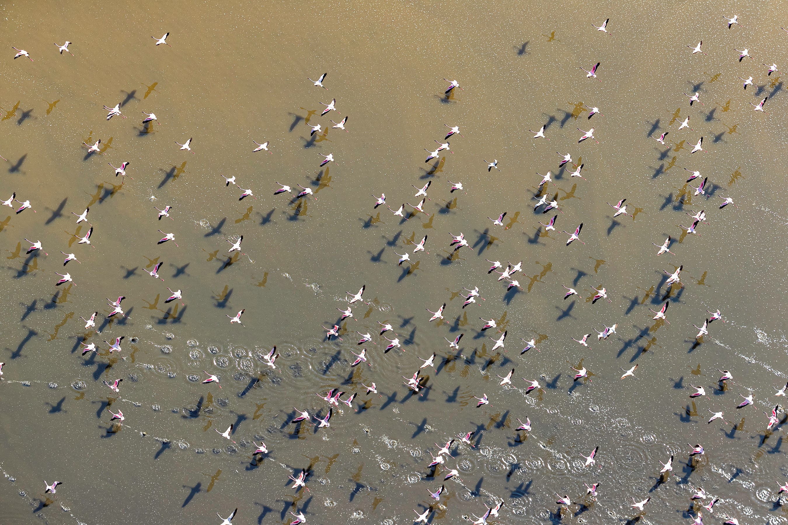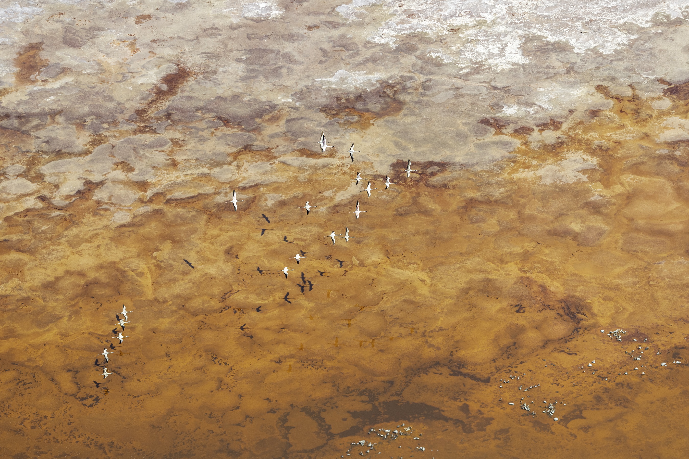 近年,航拍攝影大行其道,但拍攝者只可透過航拍機的鏡頭捕捉影像,而李秀恒這一趟非洲之旅,卻是一次不折不扣的真實航拍旅程。「最近一次去非洲是去年9月,我特意租用了直升機,並提早找來對攝影有認識的機師,先後組織逾一年,為的就是要追蹤拍攝鳥群在非洲上空翱翔的畫面。」他描述,這種真正的「航拍」手法,拍攝過程一點也不容易,為了能捕捉鳥群的動感,兩邊的直升機門均被拆卸,於機內拍攝有一定危險性。不過,高空拍攝卻帶來意想不到的效果。「一般拍攝鳥類皆是平面角度,或是雀鳥站立在樹枝上,或是仰角拍攝雀鳥飛翔的場景。這次從高空拍攝,鳥群於飛機之下,我在高處俯瞰牠們展翅高飛的情景,與大地景色融合,相當漂亮。」李秀恒鏡頭下的雀鳥恍如天然的抽象畫,無論是飛行還是休憩,配上了自然形成的不同顏色、形態的大地,便成為一幅幅寫意而獨特的藝術品。