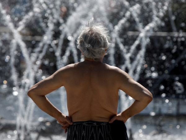 波蘭華沙,一名男子在炎熱的天氣下進行日光浴。