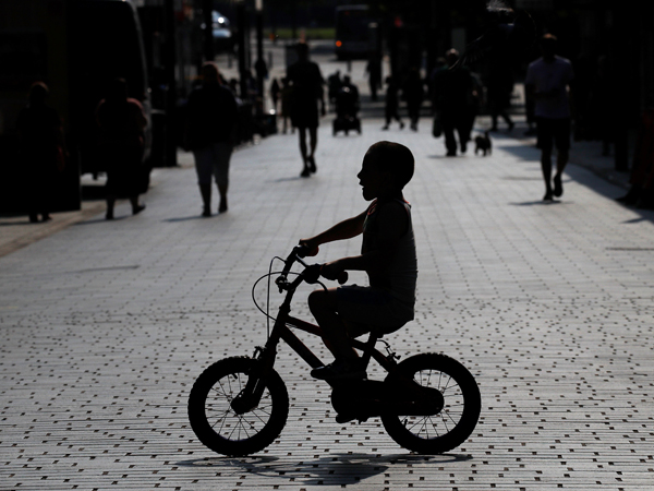 英國聖海倫斯,一個孩子騎自行車穿過安靜的購物街。