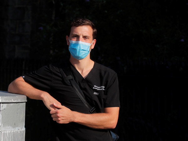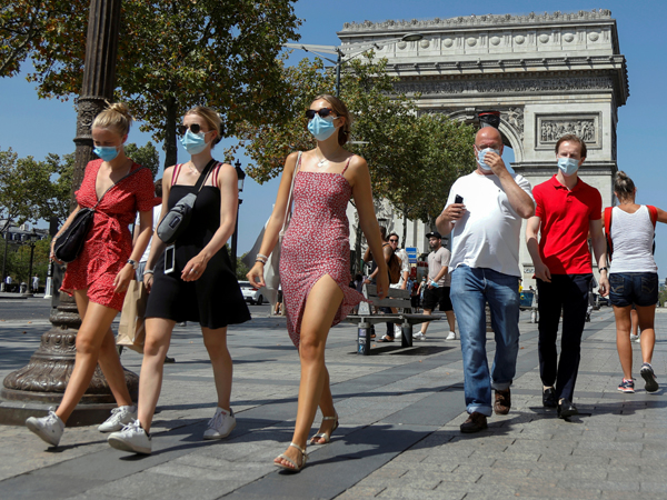 法國巴黎,人們帶著防護面具走在凱旋門附近的香榭麗舍大街上。