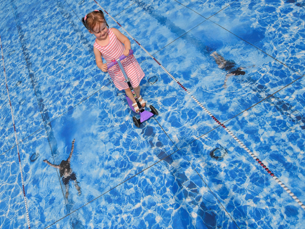 英國倫敦,3歲的伊麗莎在一幅描繪遊泳池的臨時地板上滑行玩耍。