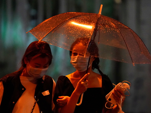 中國北京,兩位女士戴著口罩撐著雨傘走在街上。