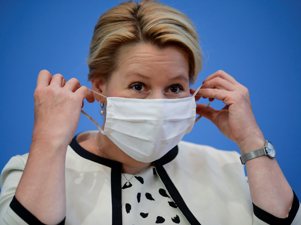 德國柏林,一名政府官員在舉行新聞發布會前,調整她的防護口罩。