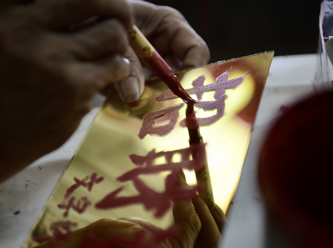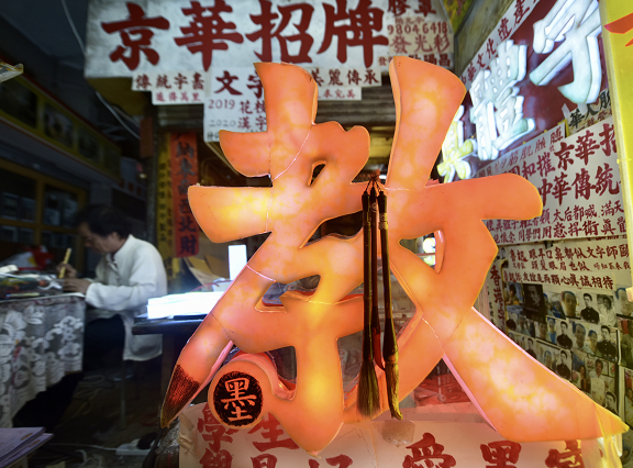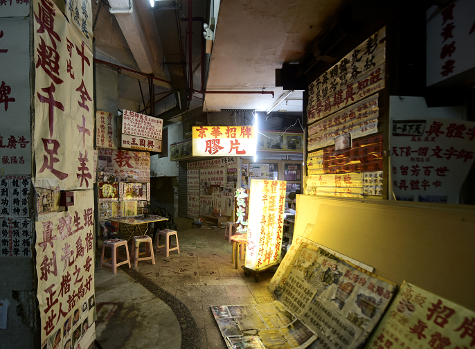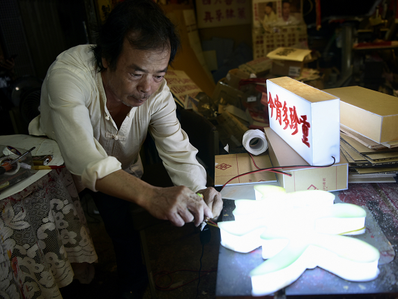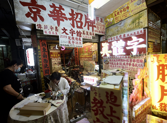 【香港商報網訊】據中新社報道,香港北角皇都戲院于1952年落成,是香港僅存的單幢式戲院,現時戲院地面的皇都商場內十室九空,而商場內有一間製作招牌的“京華招牌”店鋪却燈火通明。店主歐陽昌30多年來以自創的“真體字”爲店鋪寫招牌、製作燈箱等,傳承中華文化。(圖源:中新社)