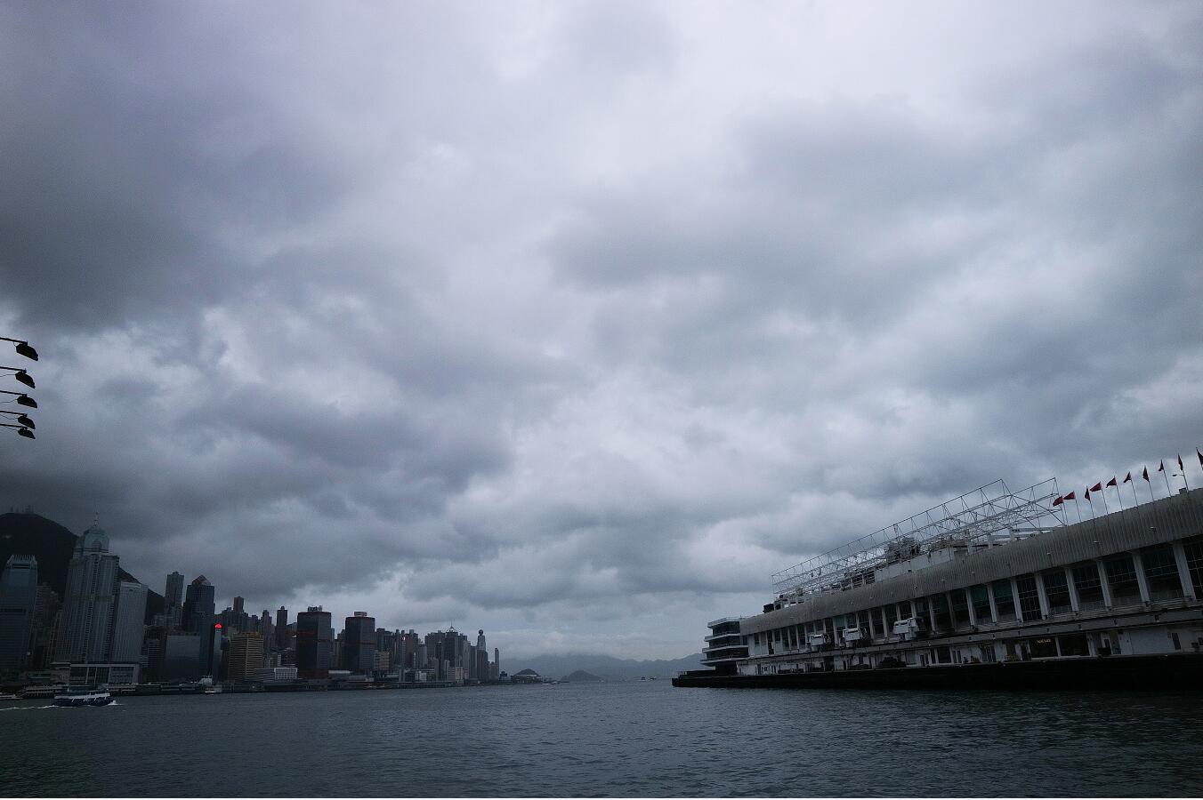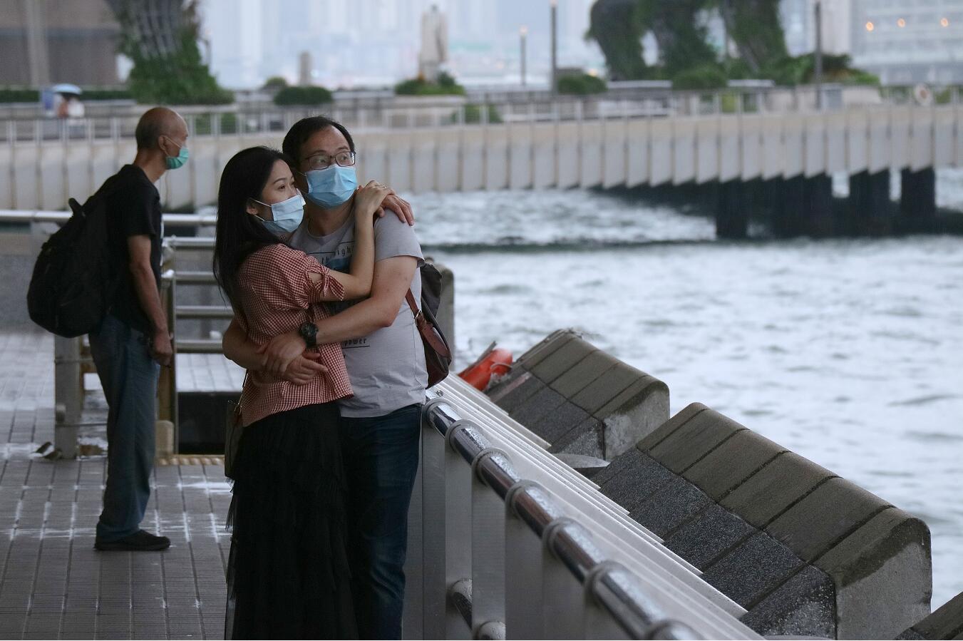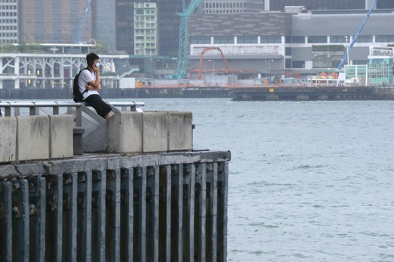 傍晚時份維港上空風起雲湧,海面有湧浪。有市民趕回家、有市民在海濱觀浪,有店舖提早關門並做防風措施。(馮瀚文攝)