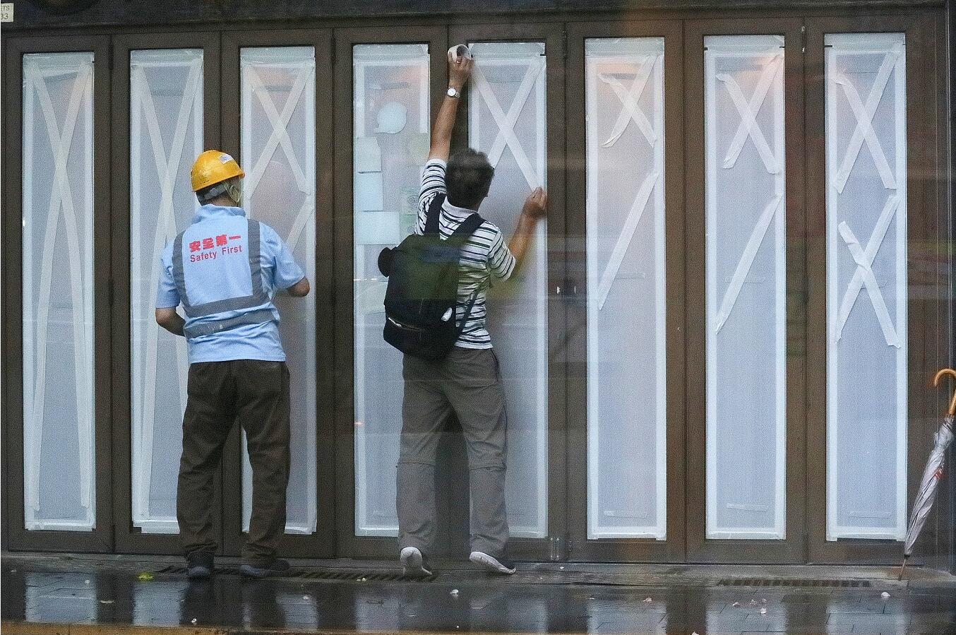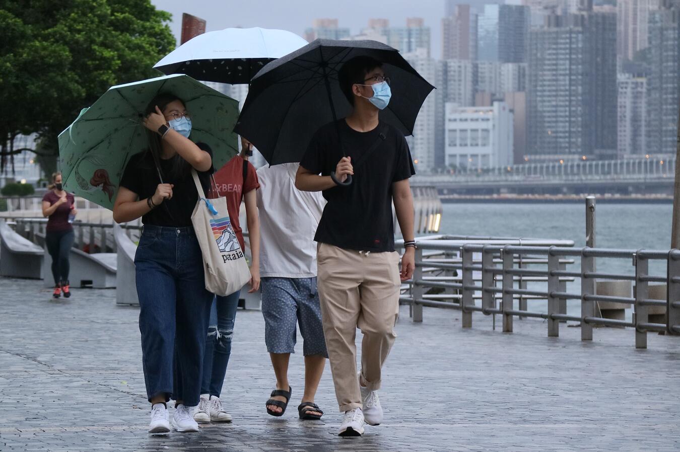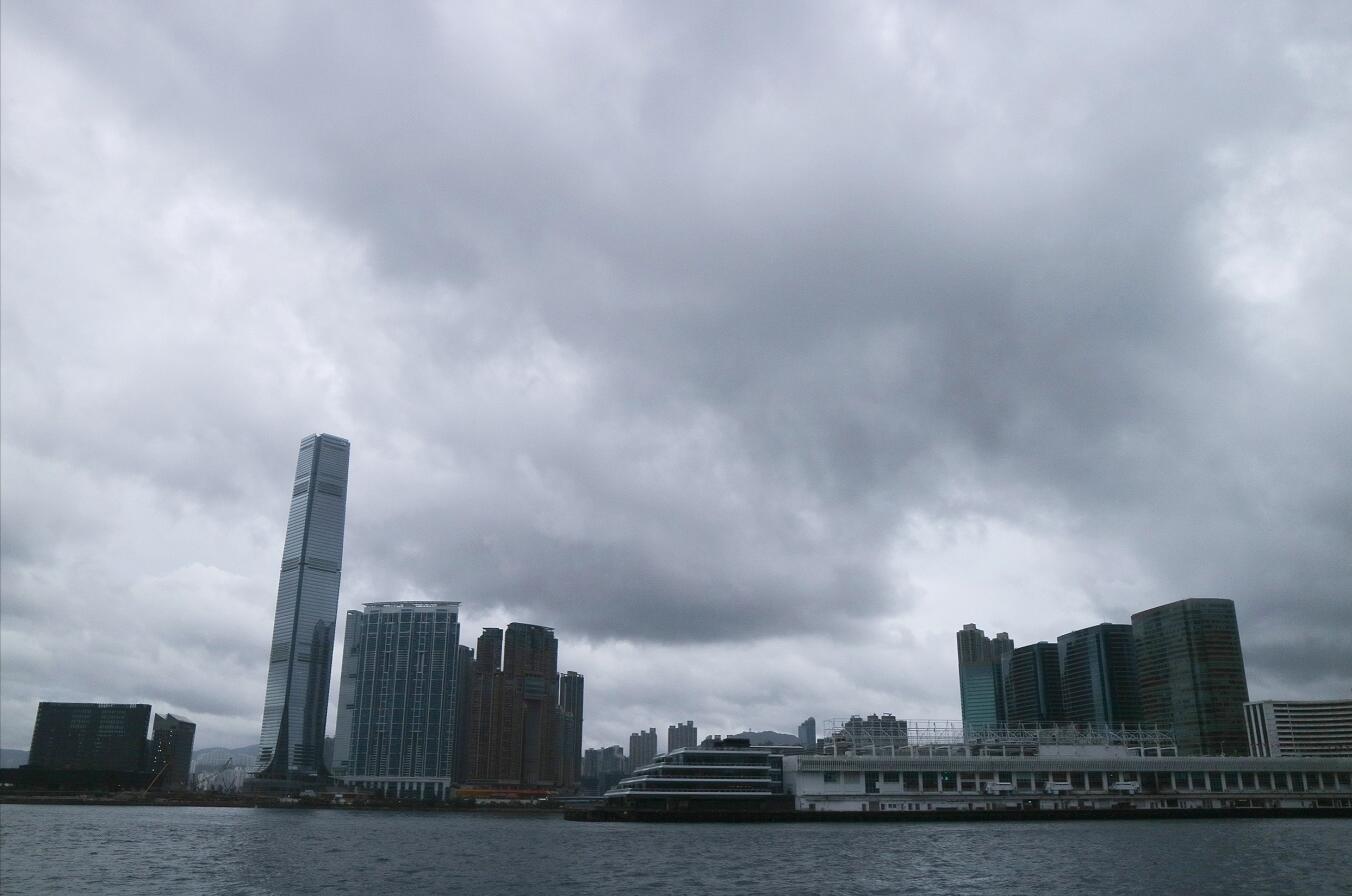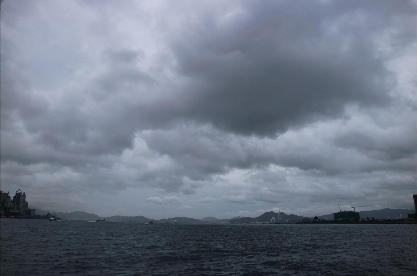 傍晚時份維港上空風起雲湧,海面有湧浪。有市民趕回家、有市民在海濱觀浪,有店舖提早關門並做防風措施。(馮瀚文攝)