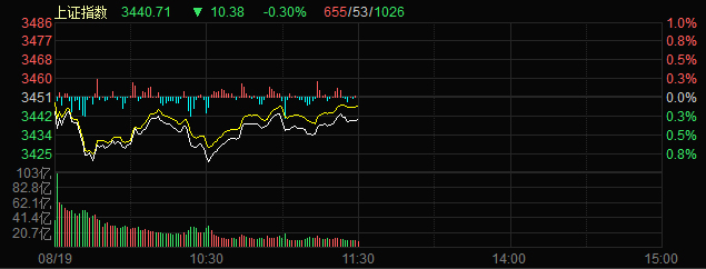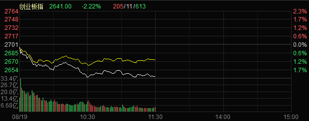 8月19日消息,內地股市開市偏軟,创业板指低开后单边下行,沪指横盘震荡表现较强,个股跌多涨少,涨停股逾40家,市场总体赚钱效应较差。大金融板块,券商股小范围异动,整体没有跟随效应,中国人寿一度跌逾7%,挫伤市场人气,农业种植、食品饮料、白酒等防御板块领涨,军工、水利、电力等题材盘中拉升,疫苗、半导体等高估值板块继续下挫,整体看,市场题材炒作低迷,缺乏主线,资金风险偏好较低。盘面上看,农业种植、食品饮料、水利等板块涨幅居前,疫苗、免税、半导体等板块跌幅居前。截至午间收盘,沪指跌0.30%,报收3440点;深成指跌1.05%,报收13623点;创业板指跌2.22%,报收2641点。