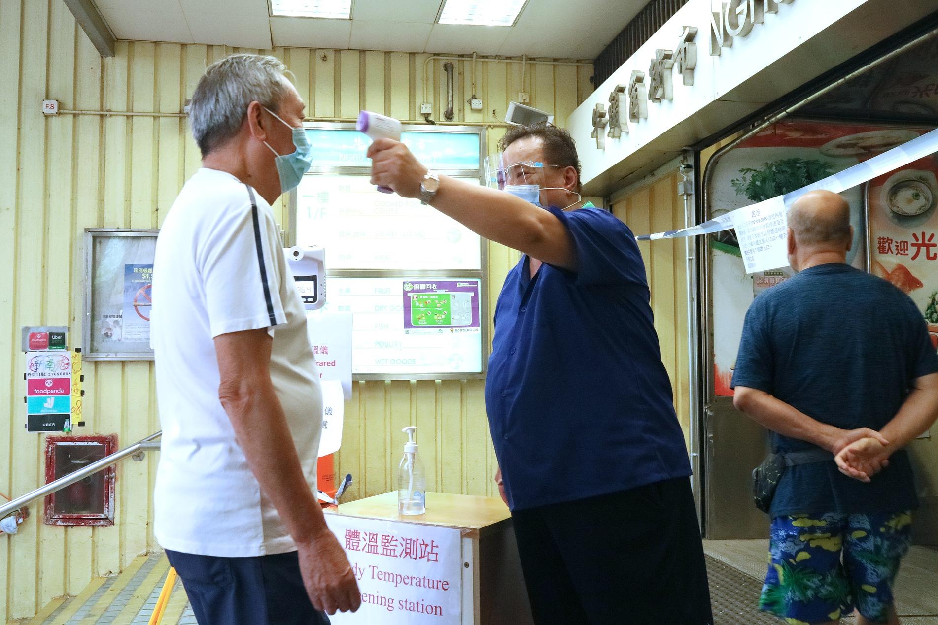 疫情下街市是高風險地方,因此政府在街市門口設有量體溫儀器,市民進入街市必須量體溫,這樣大家就可放心買菜。(冯翰文、蔡启文摄)