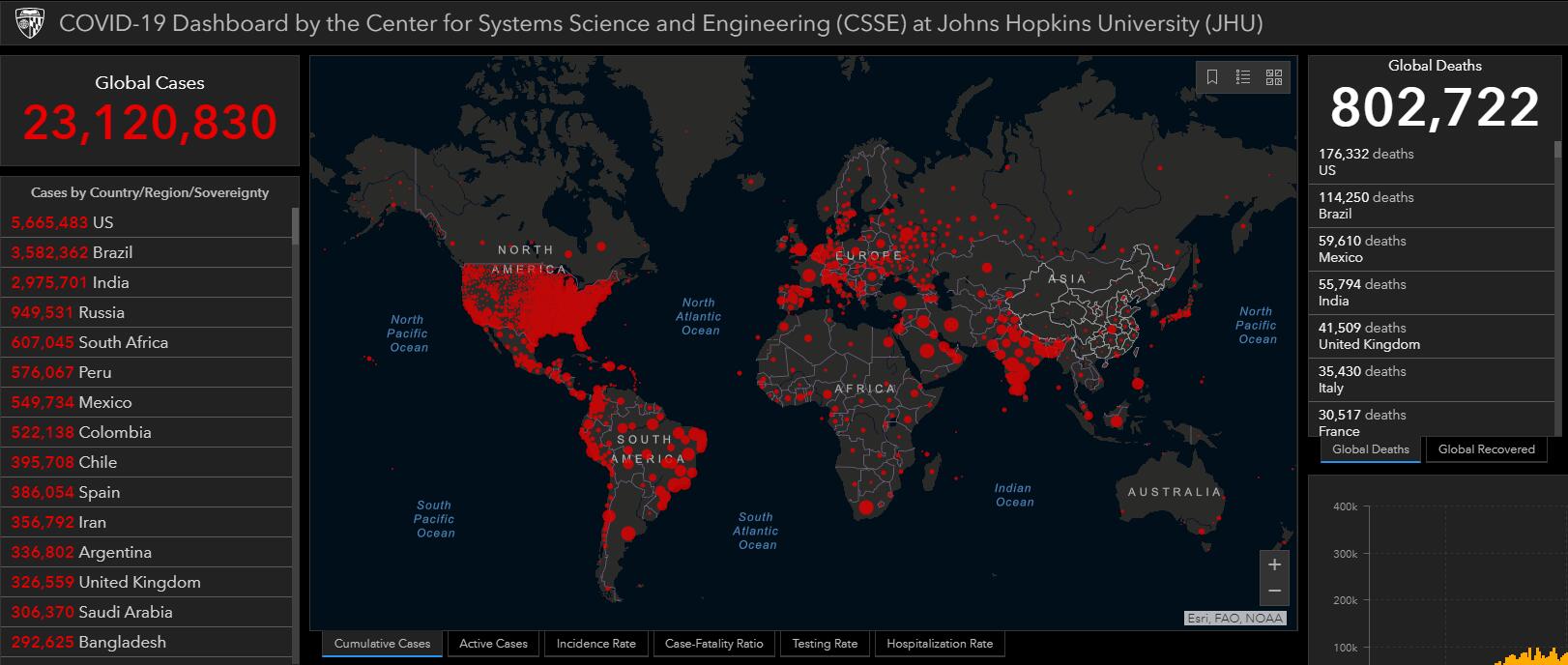 据美国约翰斯·霍普金斯大学22日发布的新冠疫情最新统计数据显示,全球累计死亡病例已超过80万例。数据显示,截至美香港时间23日早8时30左右,全球累计死亡病例为802,722例,累计确诊病例为23,120,830例。