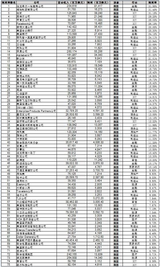 接下来我们看下美国入选企业里面,利润率超过了5%的企业,一起来震撼一把,看看美帝国主义最赚钱的公司有哪些,美国竟然有75家企业利润率超过了5%。
