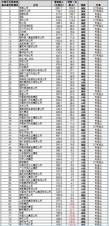 好了,接下来我们直接进行最终比较,那就是中美入选了世界五百强的制造业企业的利润比较,中美总共有74家制造业企业入选了世界五百强(包括ICT制造业)。