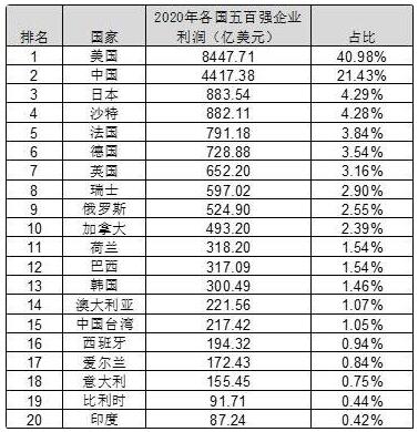 2020年全球五百强公司的利润之和为20613.17亿美元,美国公司利润总额高达8447.71亿美元,占比高达40.98%